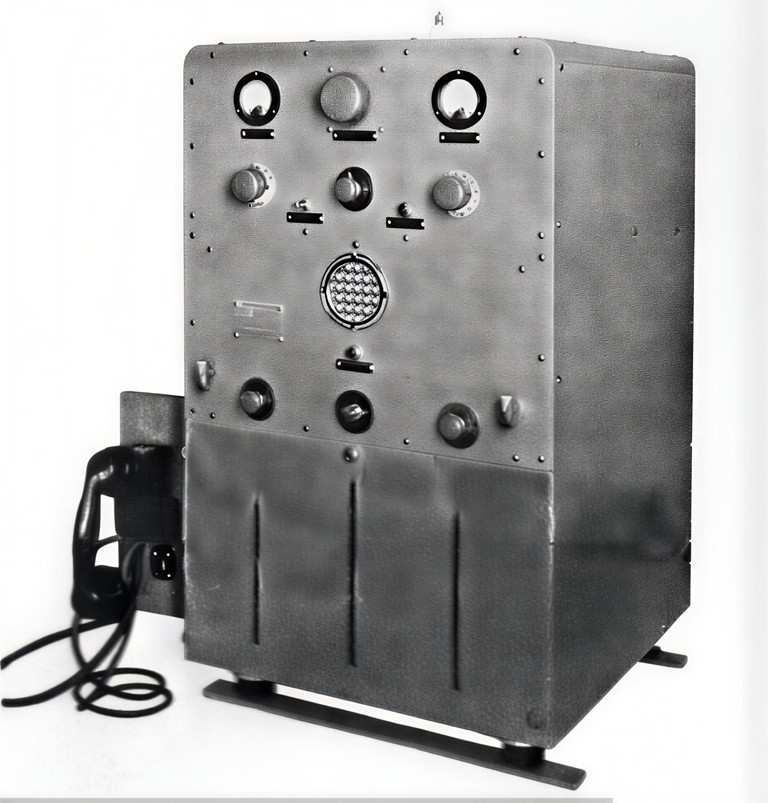 Ken Goodhue, WD6AOB, supplied the photo of the unit on the left below. According to ex-coastie, W8SU, these were used everywhere, light houses, surf boats, 40 foot motor boats for CG inter communications. A carbon mike was used for AM, and power was from a 6V. battery via a dynamotor in the power supply, or by normal 115V AC. The brass plate on the front panel has the following information on it: U.S. Coastguard Radio Transmitter Receiver Model TRP-141, Power output 5/10 Watts emission A3/A1, Frequency range 2000-9000KC. Serial No. 25. Cont. TCG-37524. Date 12/30/47. Order No. CC 8657-C. Manufactured by Radio Marine Corporation of America, New York, New York Bob Ballantine, W8SU, supplied this photo of a 1932 version of this type of unit. Nomenclature unknown.
