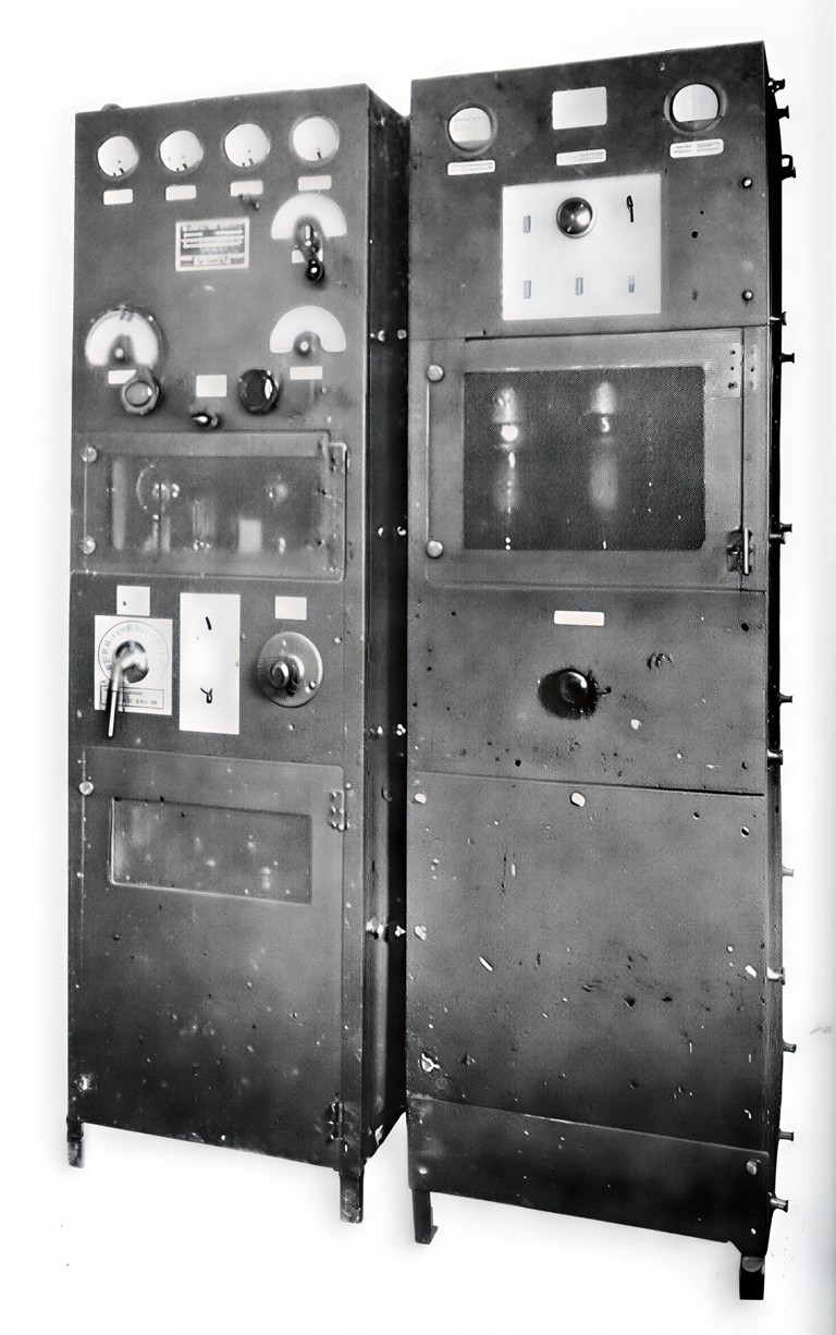 The Great Lakes Cruise ships the SS South American, SS North American and the SS Alabama each had a RMCA ET-8031 system to support multichannel AM transmission and receiving. The system had 6 receivers, a motor-generator power supply, and a coil switching transmitter housed in a large cabinet. The system was operated from a control panel that could be located anywhere on the ship. Tom Drake who served as radio op on these vessels provided the 8031 control head and cabinet images that are shown below. They are from the manual for this system.