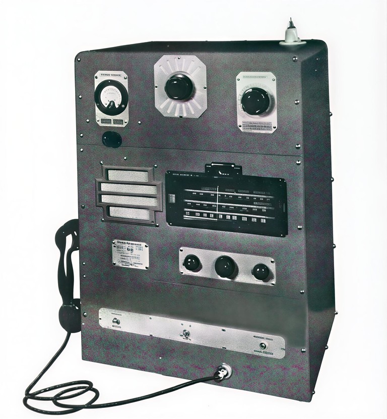 Ken Goodhue, WD6AOB, supplied the photo of the unit on the left below. According to ex-coastie, W8SU, these were used everywhere, light houses, surf boats, 40 foot motor boats for CG inter communications. A carbon mike was used for AM, and power was from a 6V. battery via a dynamotor in the power supply, or by normal 115V AC. The brass plate on the front panel has the following information on it: U.S. Coastguard Radio Transmitter Receiver Model TRP-141, Power output 5/10 Watts emission A3/A1, Frequency range 2000-9000KC. Serial No. 25. Cont. TCG-37524. Date 12/30/47. Order No. CC 8657-C. Manufactured by Radio Marine Corporation of America, New York, New York Bob Ballantine, W8SU, supplied this photo of a 1932 version of this type of unit. Nomenclature unknown.